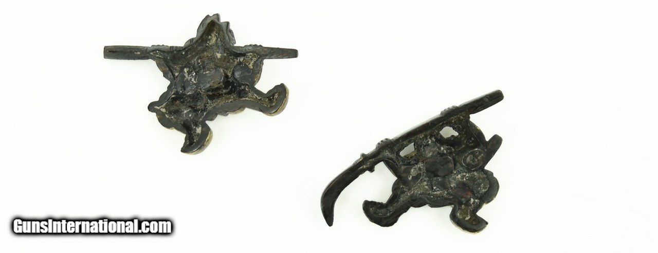 Description: "Kinko Menuki. Samurai with Naginata, and other samurai with arrow quiver highlighted in gold and silver. Excellent condition. SOLD |