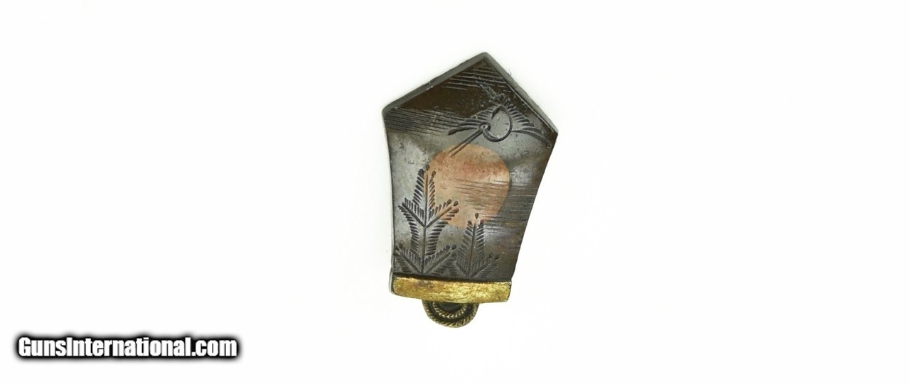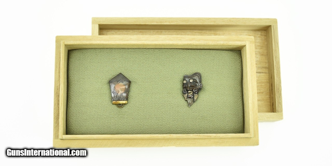 Description: "Kinko Menuki. Noh mask in Shakudo, Shibuichi and gold. Signed: Nao. The other, Bird in flight against the Sun with ferns. Signed: Tuki. Worked in Yedo early 19th Century. Yanagawa School. SOLD |