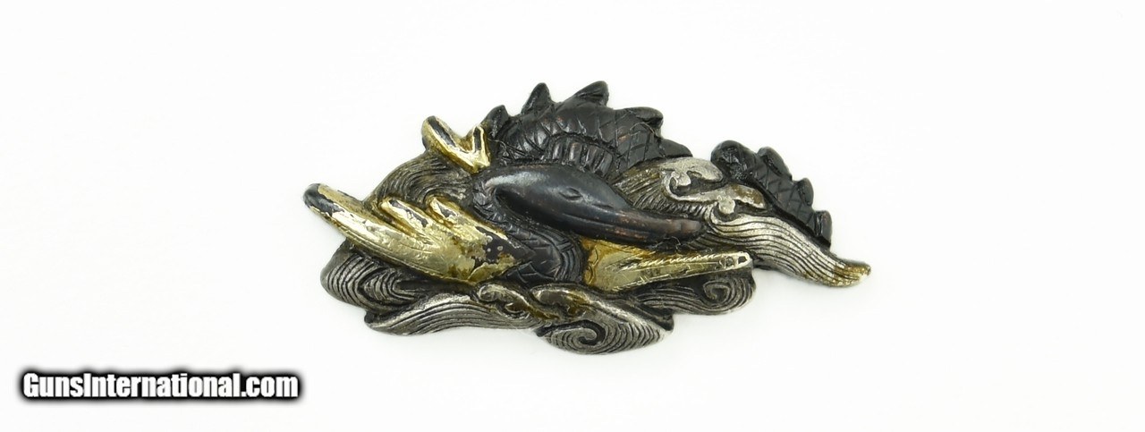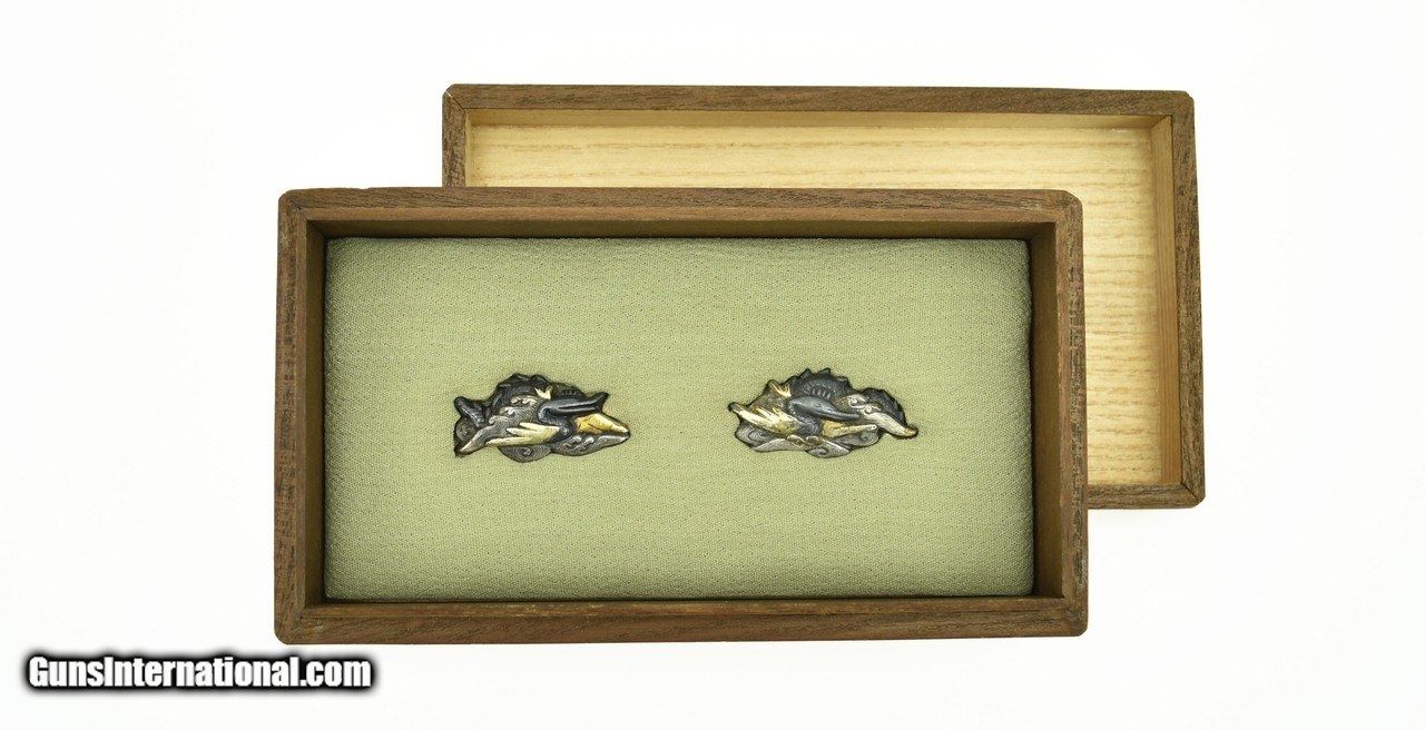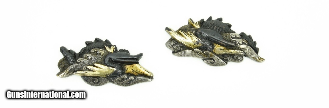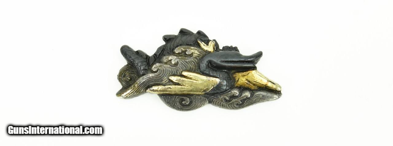 Description: "Kinko Menuki. Cormorants in clouds. Katana sized. Unsigned. Gold, silver, and Shakudo. Custom fitted box. Very attractive pair of Menuki. SOLD |
