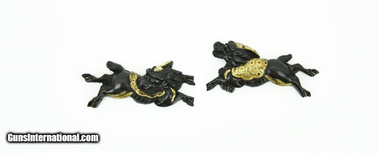 Description: "Kinko Menuki of running Shi-Shi in Shakudo and gold. Katana sized. SOLD |