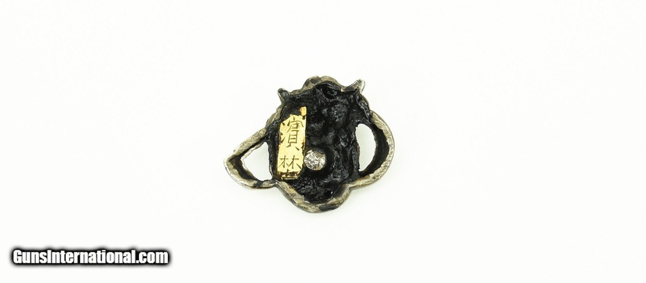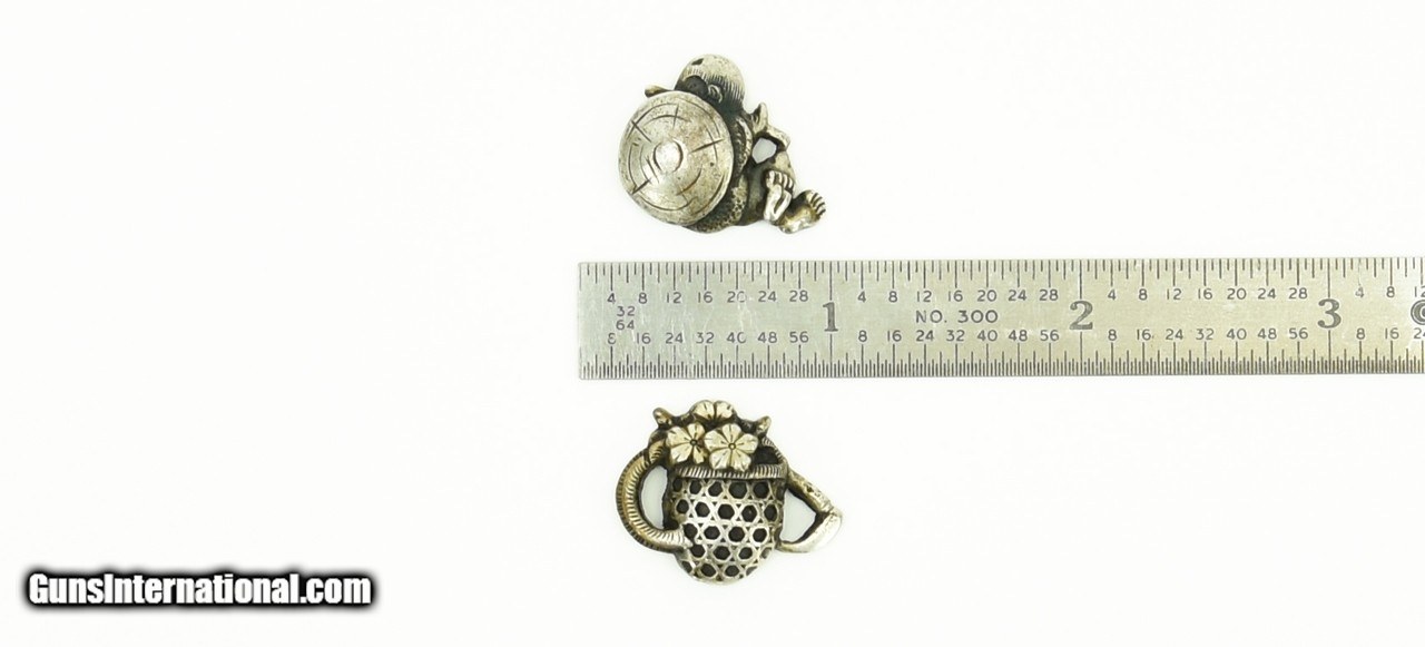 Description: "Kinko Menuki. Vase with Flowers. Figure with Jingasa. Solid silver. Signed. SOLD |