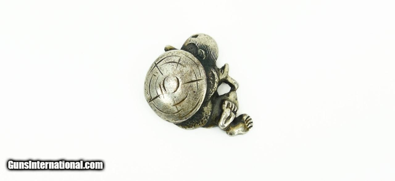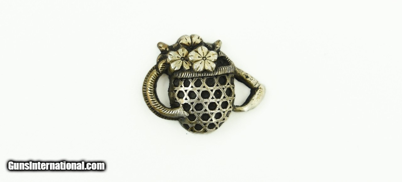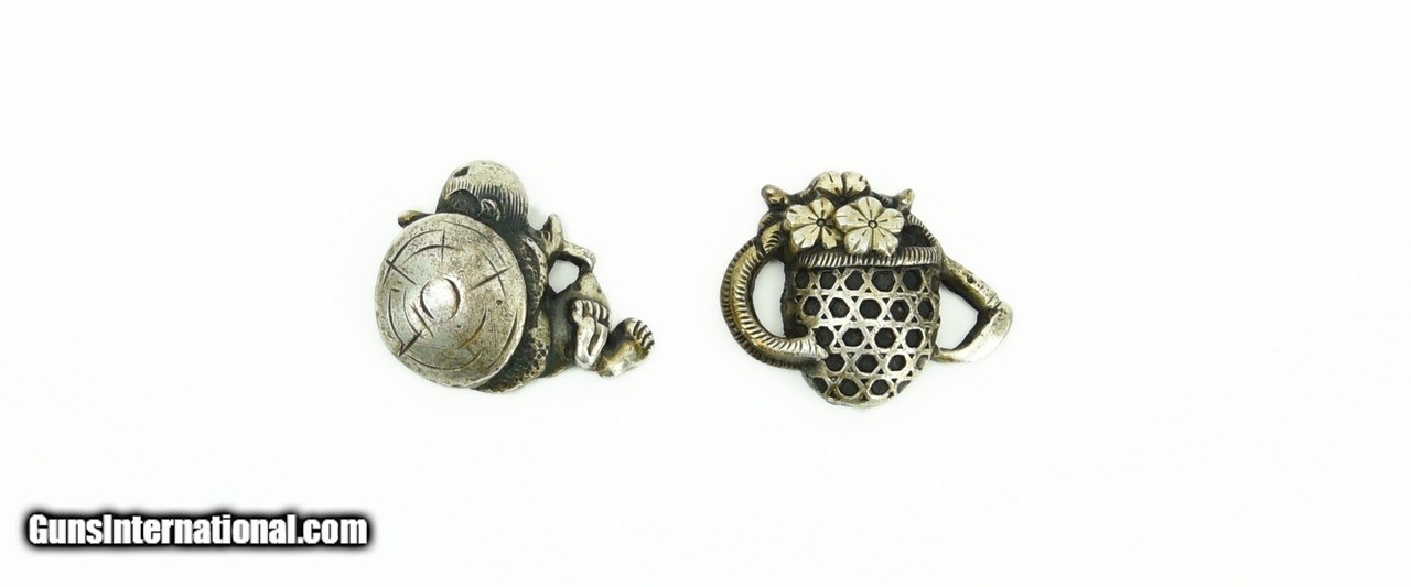 Description: "Kinko Menuki. Vase with Flowers. Figure with Jingasa. Solid silver. Signed. SOLD |