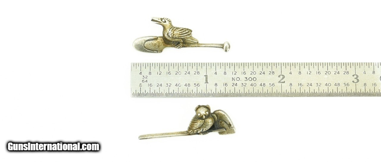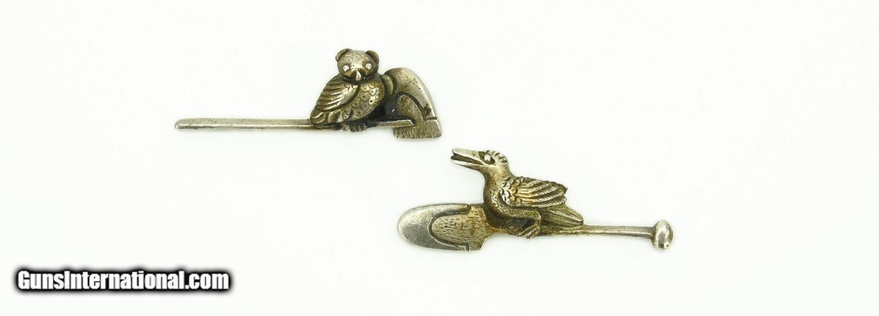 Description: "Kinko Menuki. Solid silver Wakazashi or Tanto size of birds. One bird sitting on spade, the other sitting on axe. Not signed. Very unusual subject manner. SOLD |