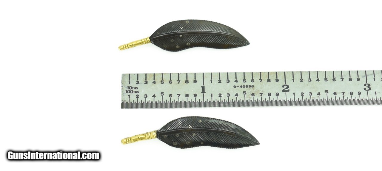 Description: "Kinko Menuki. Feather with gold and shakudo. Probably Goto School. Excellent condition. SOLD |