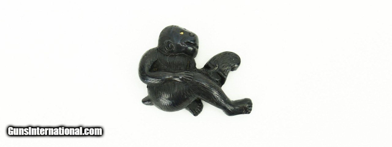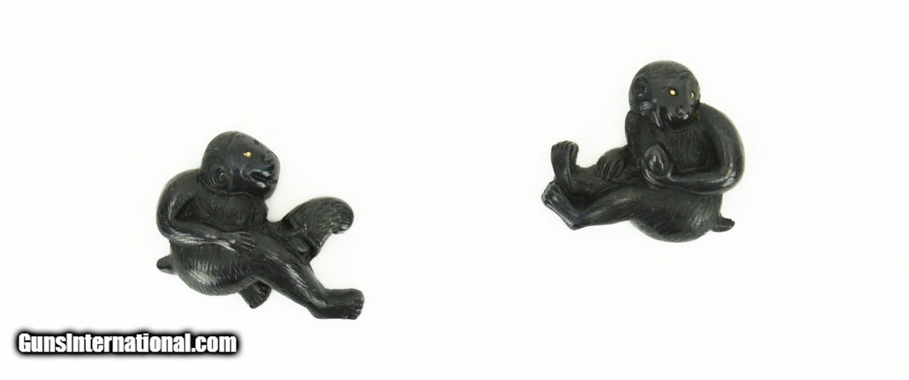 Description: "Kinko Menuki. Shakudo monkeys with gold eyes. One monkey holding a coconut, and the other holding a scholar’s hat. Tanto size. N.B.T.H.K. Hozon (1969). Edo period 19th Century. SOLD |