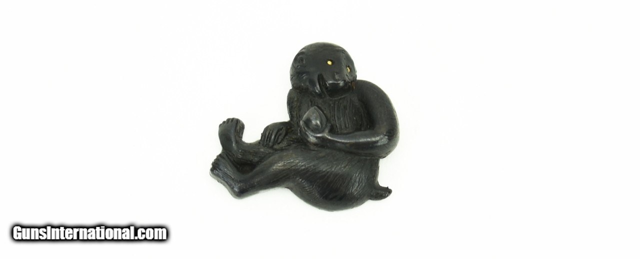 Description: "Kinko Menuki. Shakudo monkeys with gold eyes. One monkey holding a coconut, and the other holding a scholar’s hat. Tanto size. N.B.T.H.K. Hozon (1969). Edo period 19th Century. SOLD |
