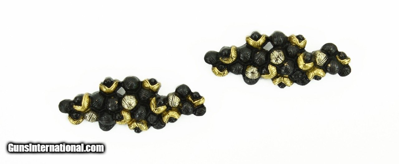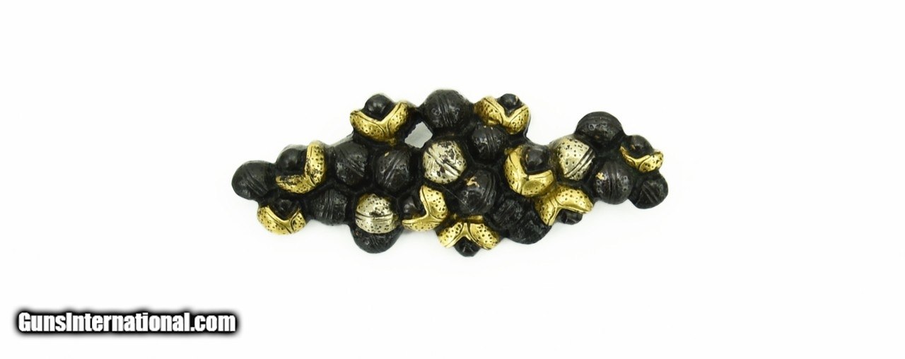 Description: "Kinko Menuki. Cluster of nuts in the shell, in shakudo, gold, and silver. Unsigned. SOLD |