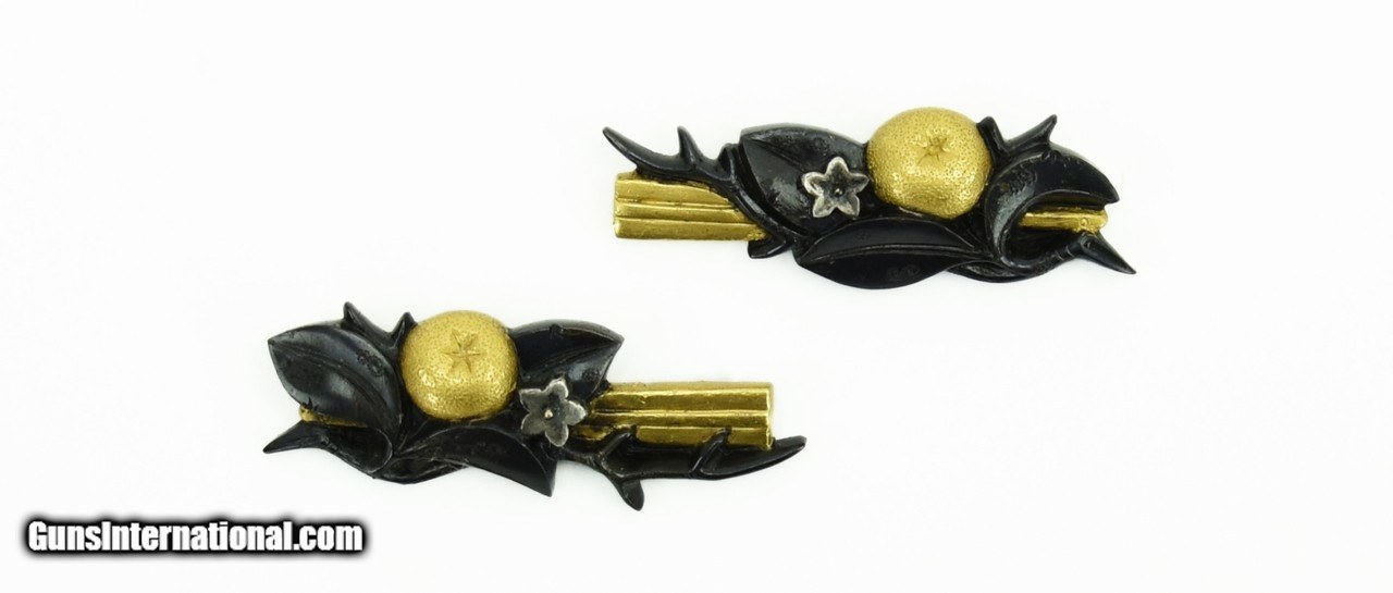 Description: "Kinko Menuki. Formed a Tachibana orange, flower Blossom, and folded fan. Shakudo, silver, and gold highlights. Unsigned. SOLD |