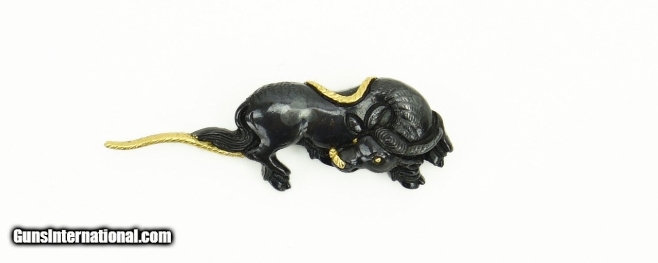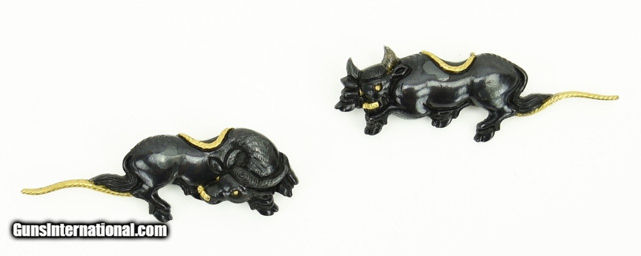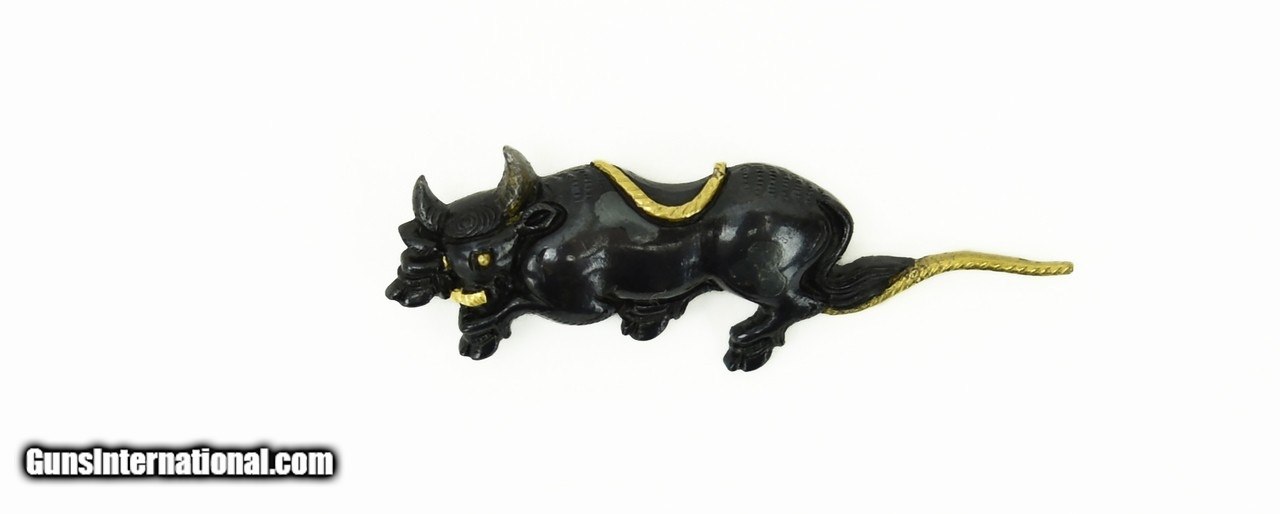 Description: "Kinko Menuki. Shakudo oxen with gold leads. Unsigned. SOLD |