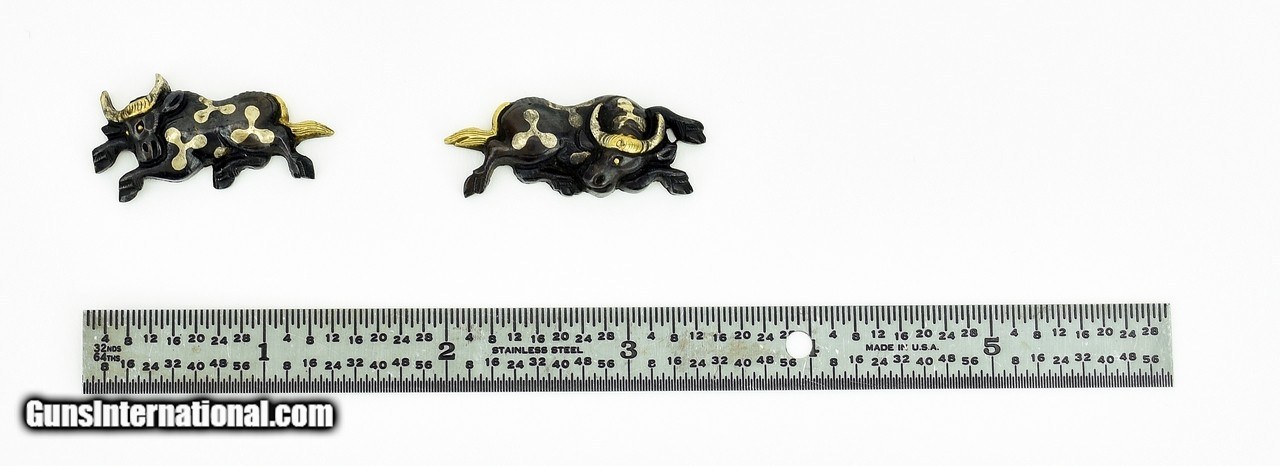 Description: "Kinko Menuki. Shakudo oxen with gold and silver highlights. Unsigned. SOLD |