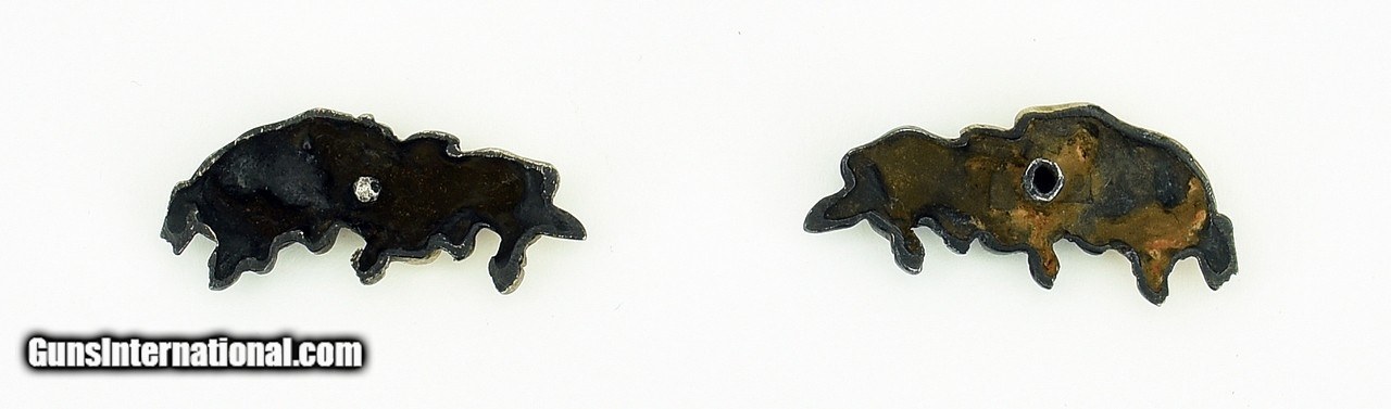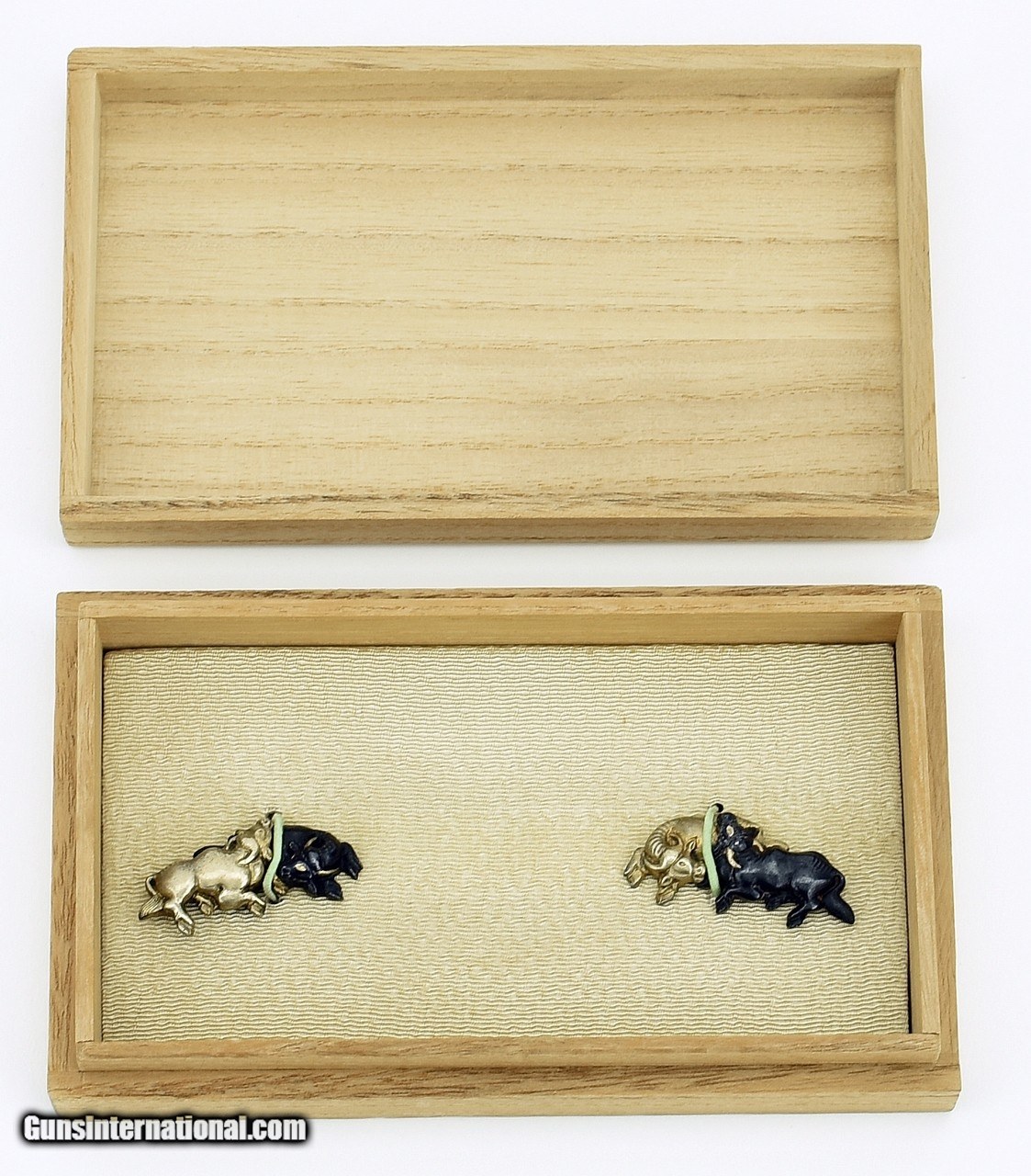Description: "Kinko Menuki. Pairs of oxen in shakudo and gilt. Unsigned. SOLD |