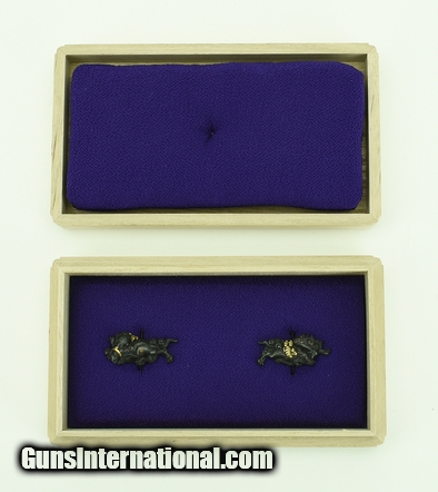 Description: "Kinko Menuki. Shakudo shi-shi with gold highlights. SOLD |
