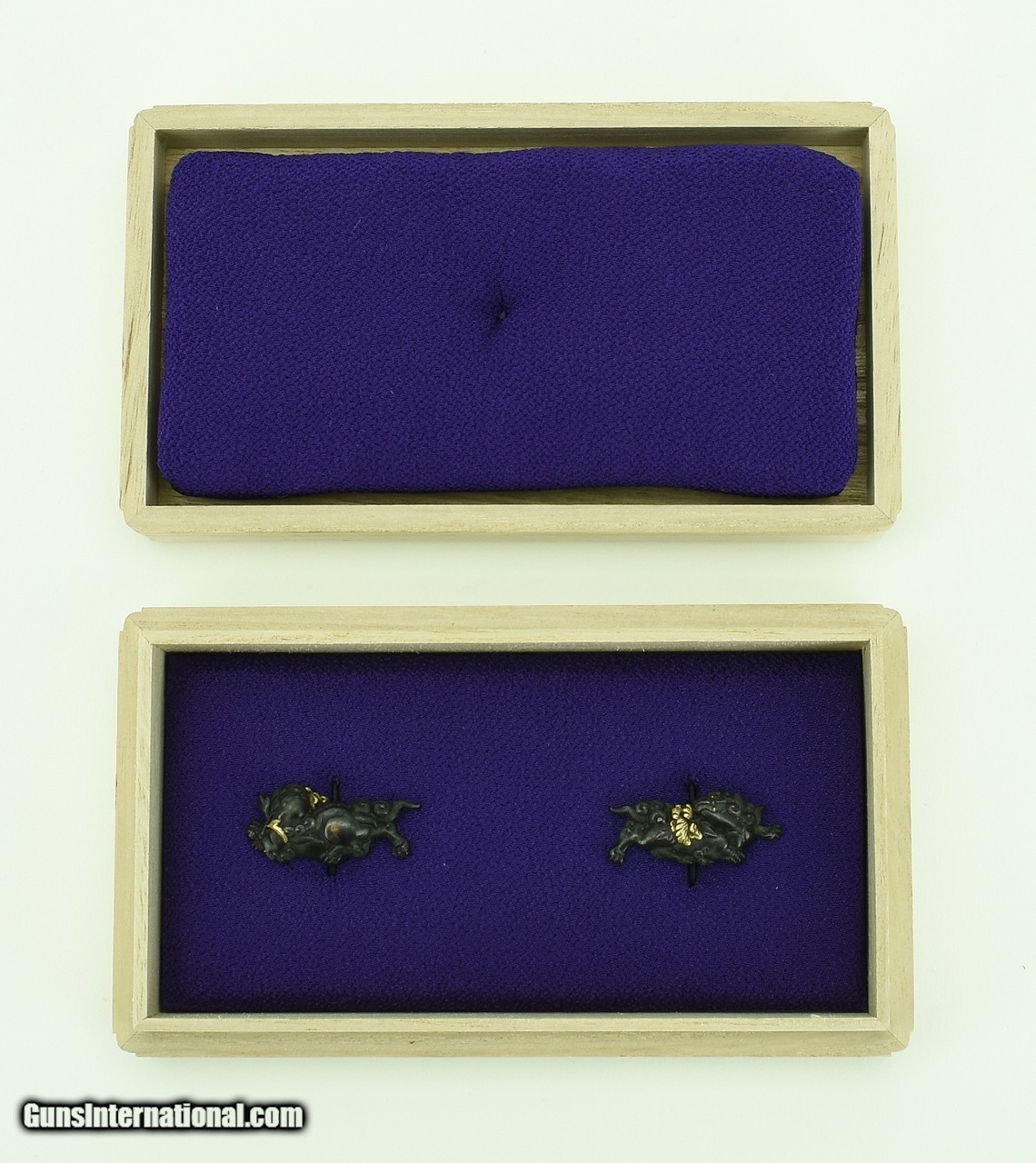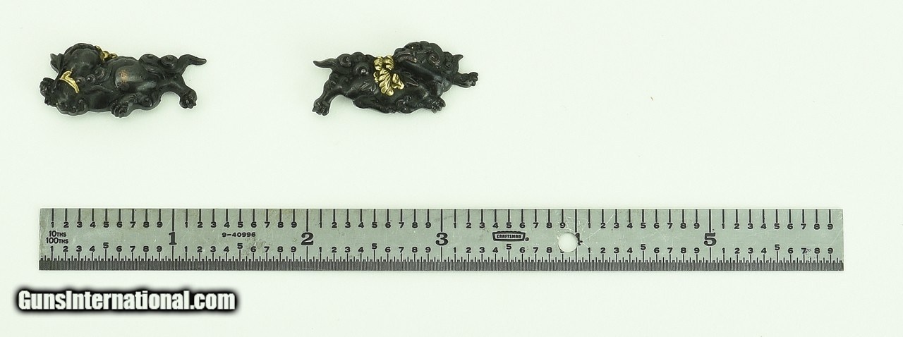 Description: "Kinko Menuki. Shakudo shi-shi with gold highlights. SOLD |