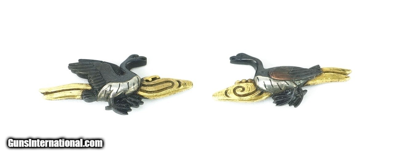Description: "Kinko Menuki. Pair of geese near stream with shakudo, gold, copper, and silver highlights. Unsigned (Mumei). SOLD |
