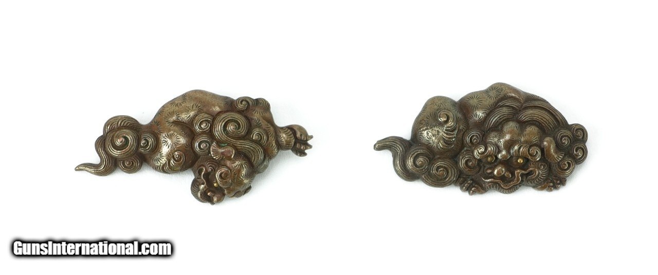 Description: "Kinko Menuki. Shi-Shi in copper with gold eyes. Unsigned. Very good workmanship. SOLD |
