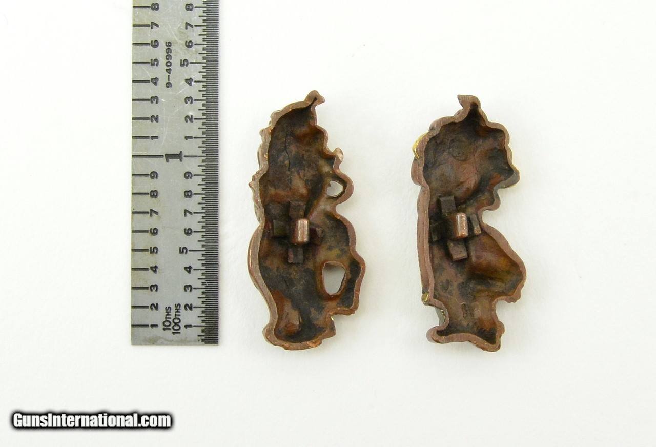 Description: "Kinko Menuki. Robed figures wearing Jingasa; one with tiger on leash the other with fanged animal on leash. Unsigned. Fine work with gold and silver shakudo. All on a copper ground. Very interesting menuki and well executed. SOLD |
