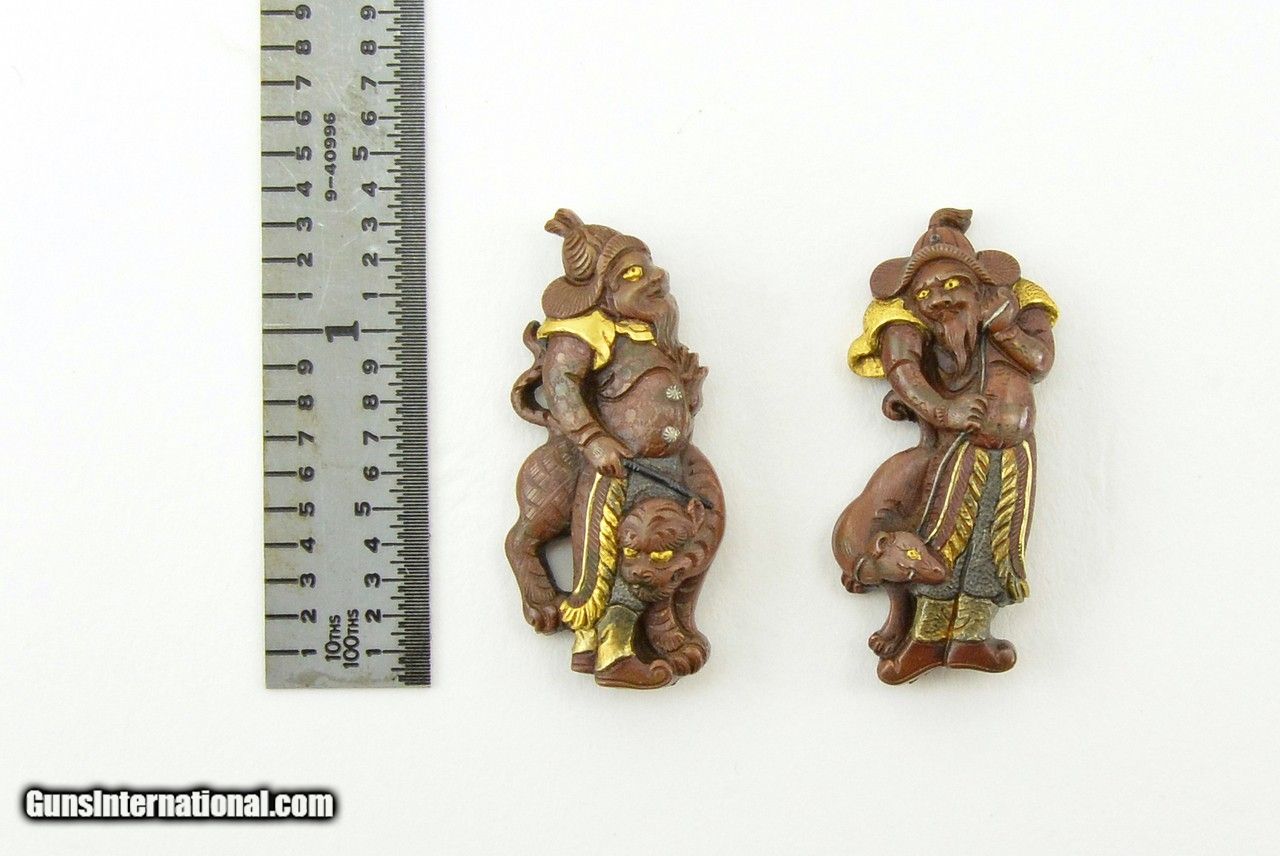 Description: "Kinko Menuki. Robed figures wearing Jingasa; one with tiger on leash the other with fanged animal on leash. Unsigned. Fine work with gold and silver shakudo. All on a copper ground. Very interesting menuki and well executed. SOLD |
