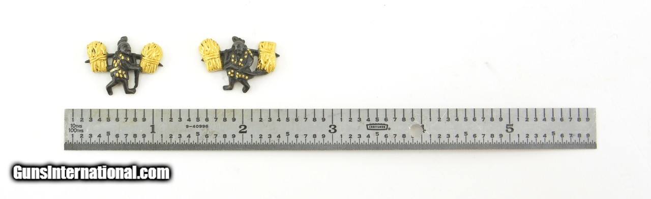 Description: "Kinko Menuki. Shakudo farmers carrying koku (rice) or straw with gold highlights. NBTHK certificate. Custom box. SOLD |