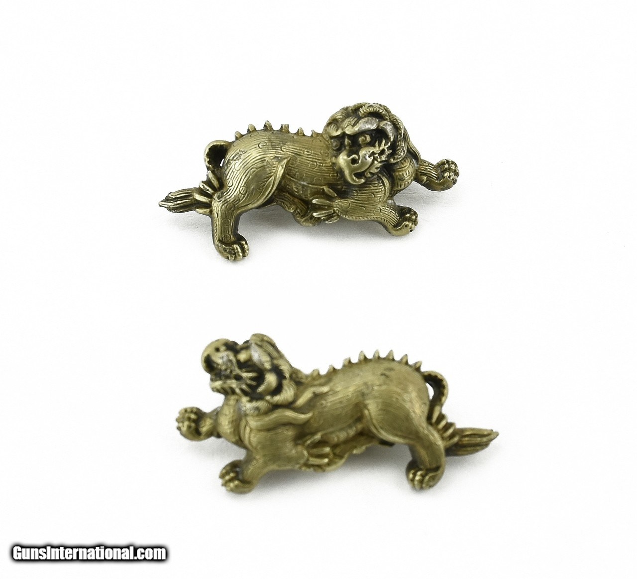 Description: "Kinko Menuki. Gold wash highly detailed Shi-Shi. Tanto size. Unsigned. Very good detail work on these Shi-Shi. SOLD |