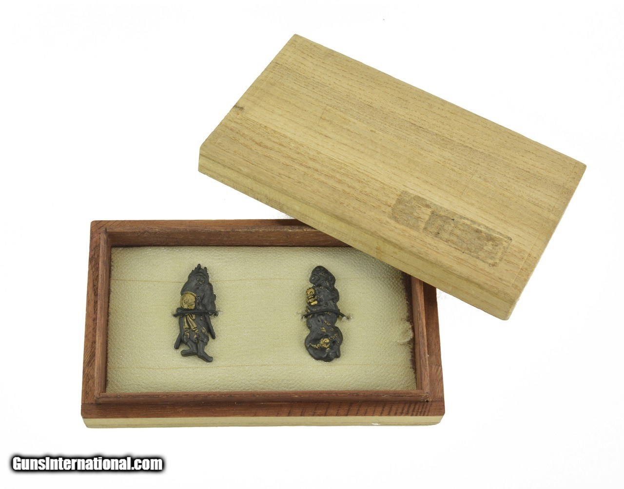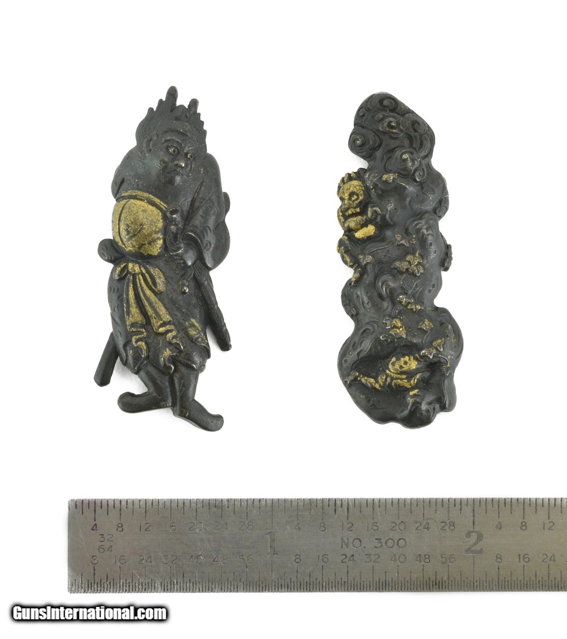 Description: "Kinko Menuki. Ghosts and demons in shakudo with gold highlights. Unsigned. Boxed. SOLD |