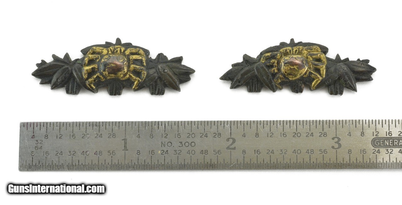 Description: "Kinko Menuki. Gold spider on shakudo leaves. Unsigned. SOLD |