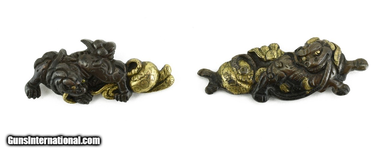 Description: "Kinko Menuki. Copper Shi-Shi with gold highlights. The Shi-Shi are guarding gold bags. Unsigned. Boxed. SOLD |