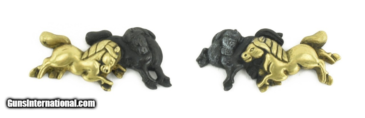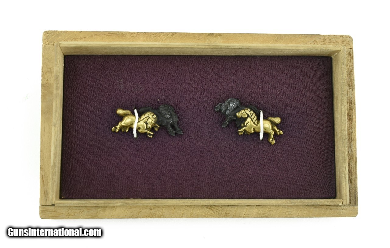Description: "Kinko Menuki. Frolicking shakudo and gold horses. Unsigned. Boxed. SOLD |