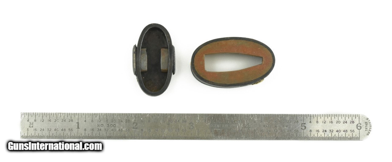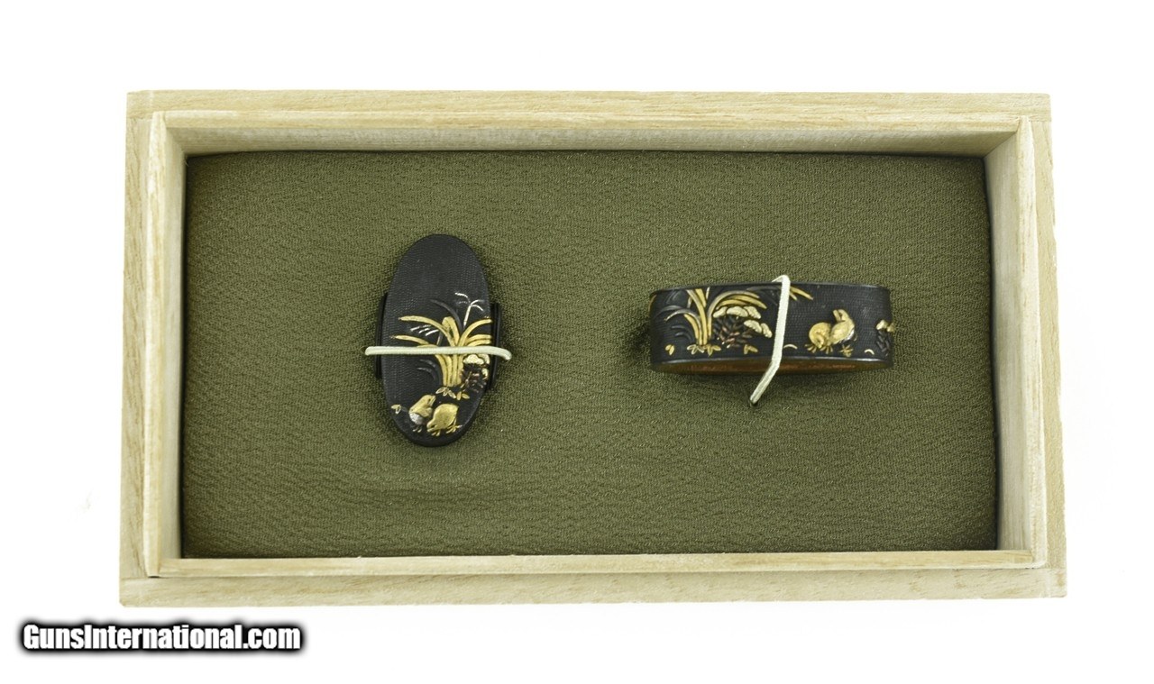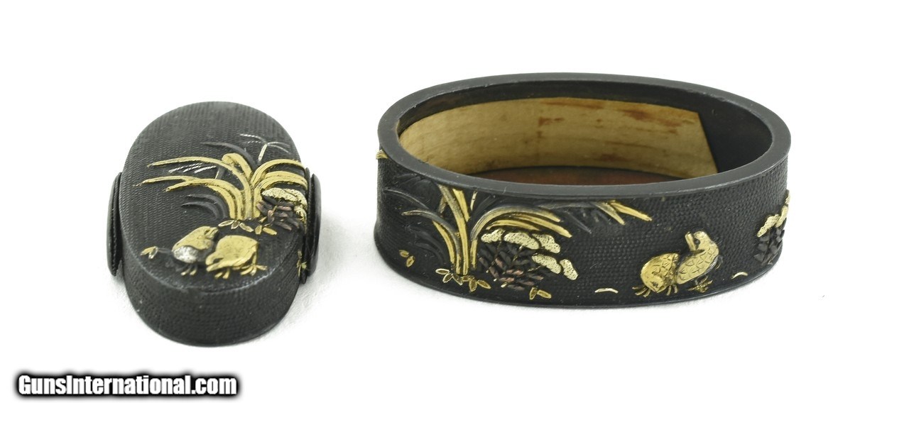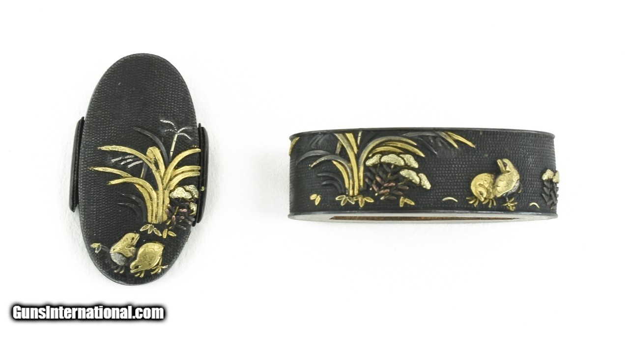 Description: "Kinko Menuki. Shakudo nanako ground. Small birds amidst foliage. Gold, silver and copper highlights. Very nice detail. Unsigned. SOLD |