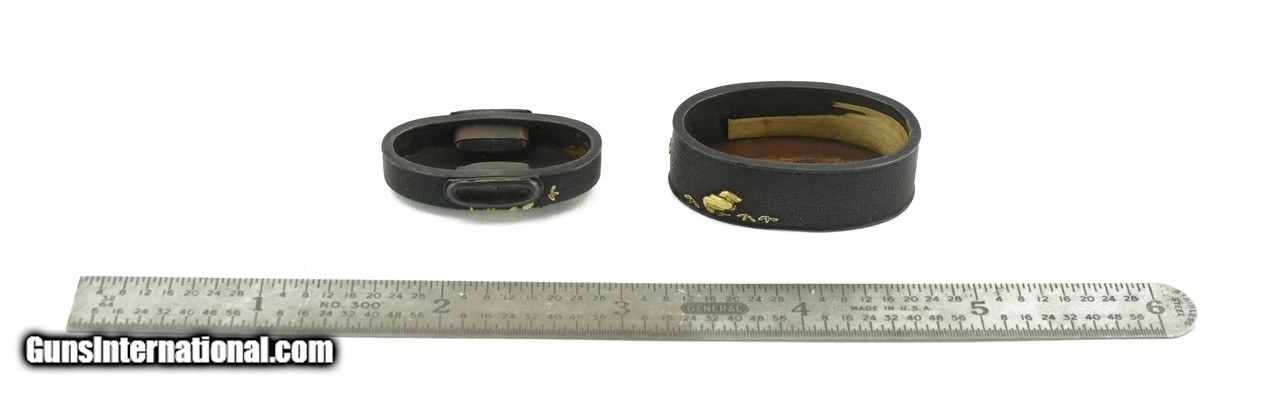 Description: "Kinko Menuki. Shakudo nanako ground. Small birds amidst foliage. Gold, silver and copper highlights. Very nice detail. Unsigned. SOLD |