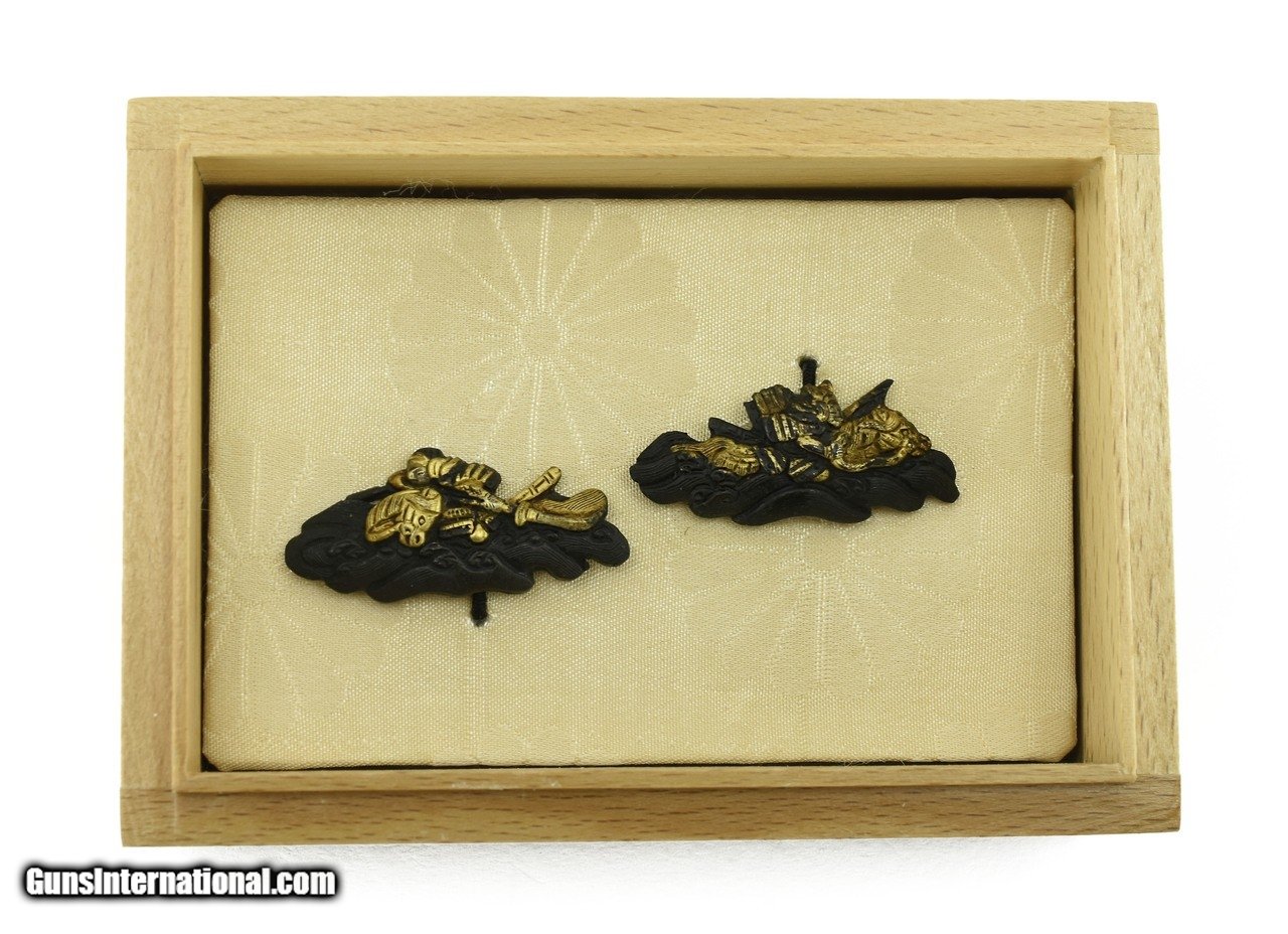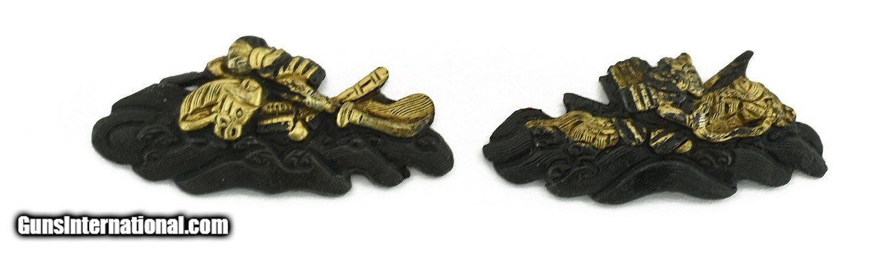 Description: "Kinko Menuki. Samurai warriors with Naginata on horseback crossing a turbulent shakudo river. Highlights in gold and silver. Unsigned. Custom boxed. SOLD |