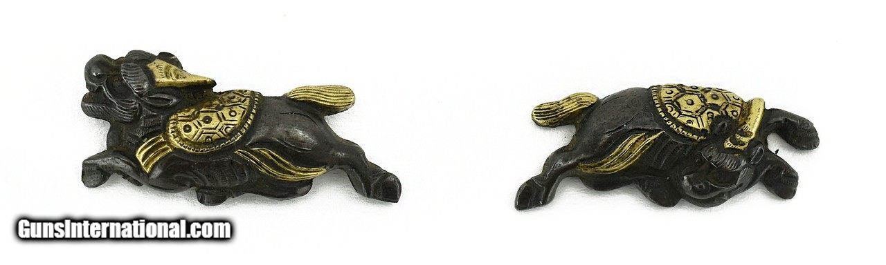 Description: "Kinko Menuki. Dog-like creatures with gold saddles. Unsigned. Boxed. SOLD |