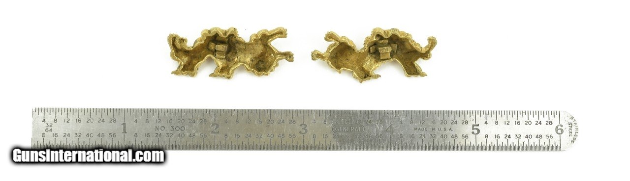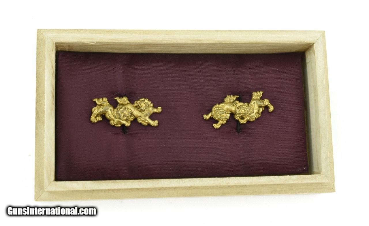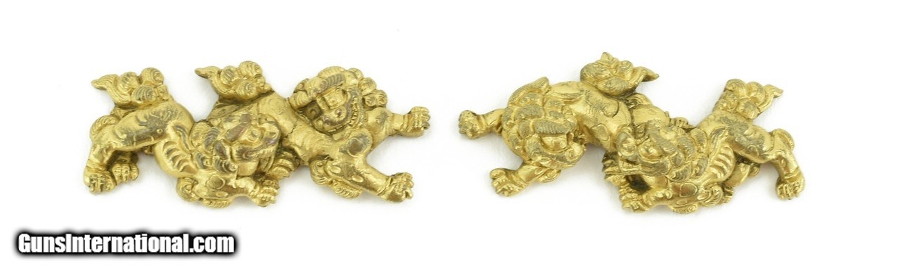 Description: "Kinko Menuki. Subject are Shi-Shi. Excellent carving and detail. Probably gold plate. SOLD |