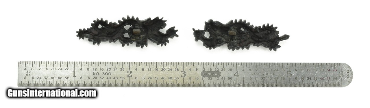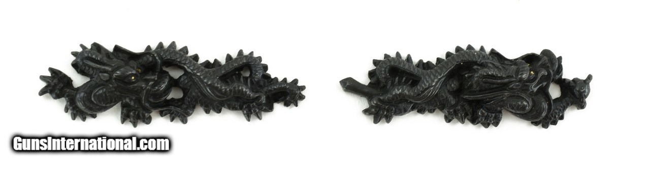 Description: "Kinko Menuki. Shakudo dragons. Gold eyes. Unsigned. Boxed. SOLD |