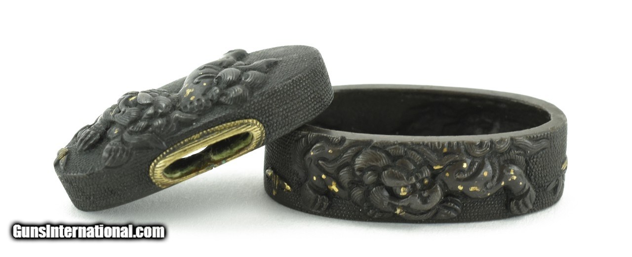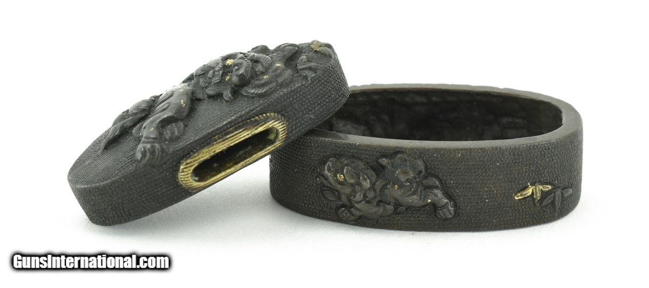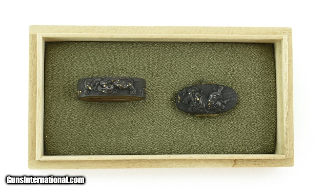 Description: "Kinko Menuki. Shakudo nanako ground. Motif of Shi-Shi with gold eyes and highlights. Unsigned. Boxed. SOLD |