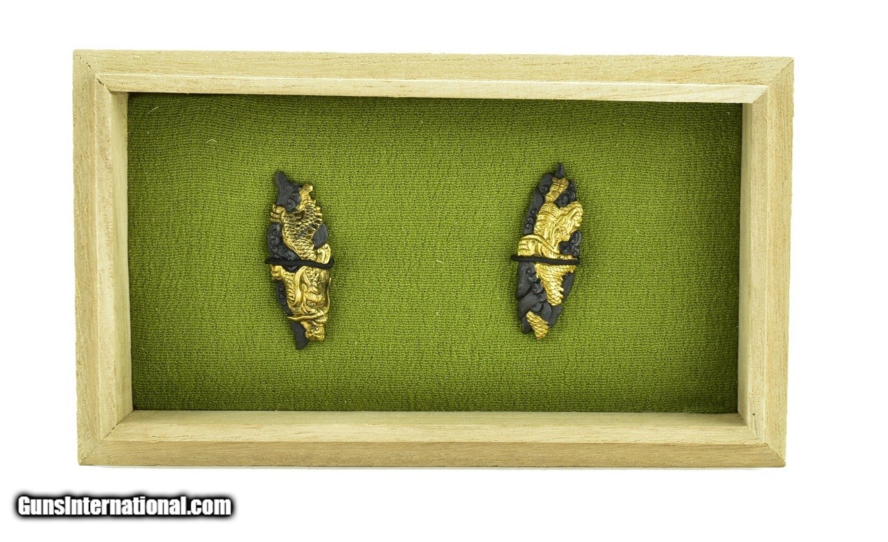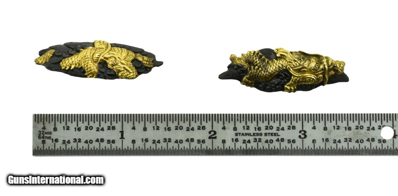 Description: "Kinko Menuki. Gold dragons amidst turbulent waves. Unsigned. Boxed. SOLD |