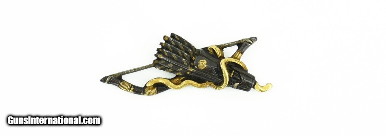Description: "Kinko Menuki Shakudo. Bow and Arrow motif with gold highlights. Fine detail. Excellent condition. SOLD |