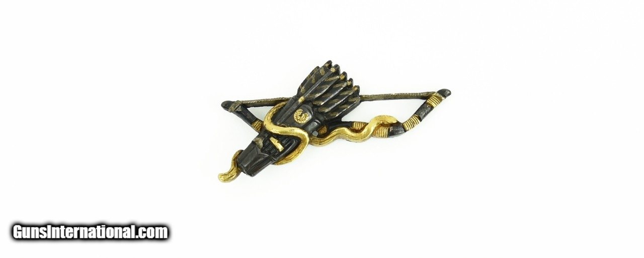 Description: "Kinko Menuki Shakudo. Bow and Arrow motif with gold highlights. Fine detail. Excellent condition. SOLD |