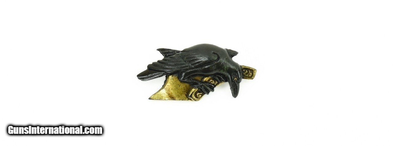 Description: "Kinko Menuki Shakudo motif of Crows on gold Perch. Very good condition. Unsigned (Mumei). SOLD |