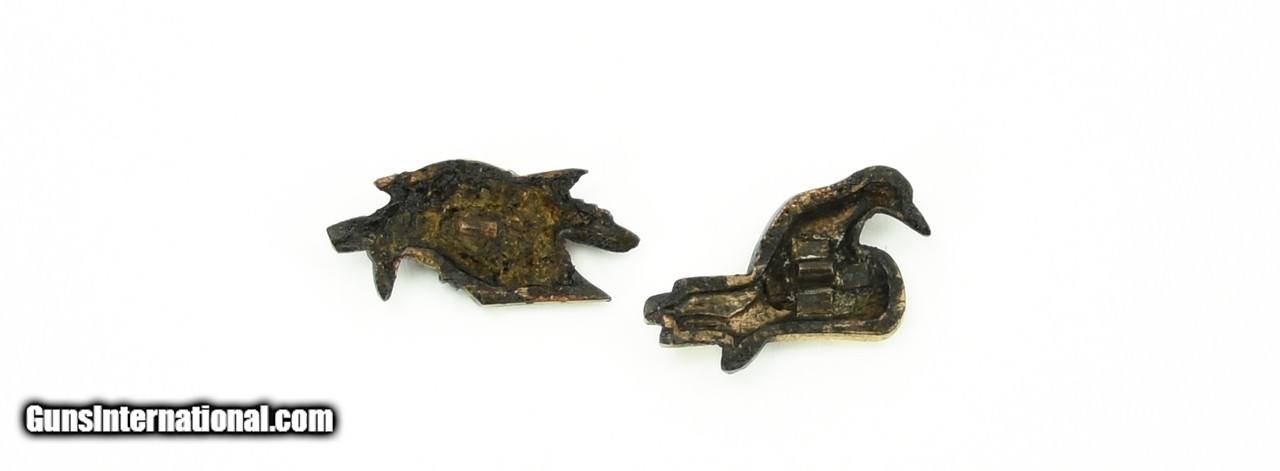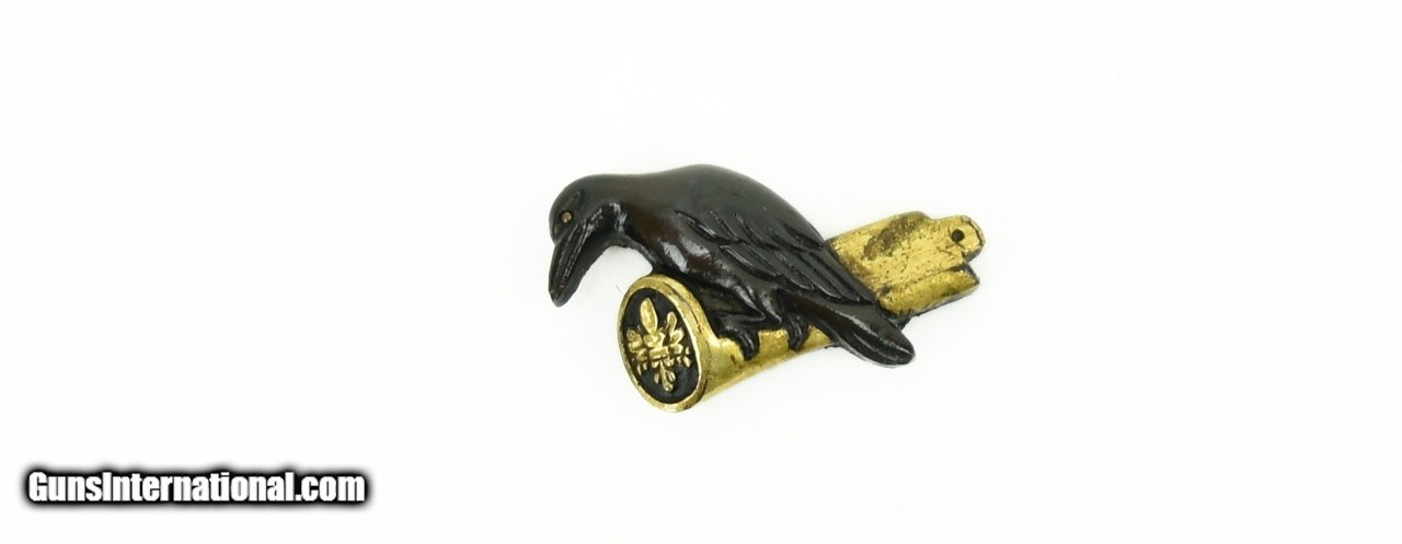 Description: "Kinko Menuki Shakudo motif of Crows on gold Perch. Very good condition. Unsigned (Mumei). SOLD |