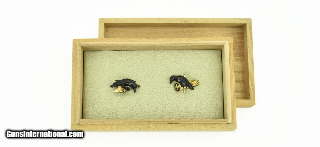 Description: "Kinko Menuki Shakudo motif of Crows on gold Perch. Very good condition. Unsigned (Mumei). SOLD |