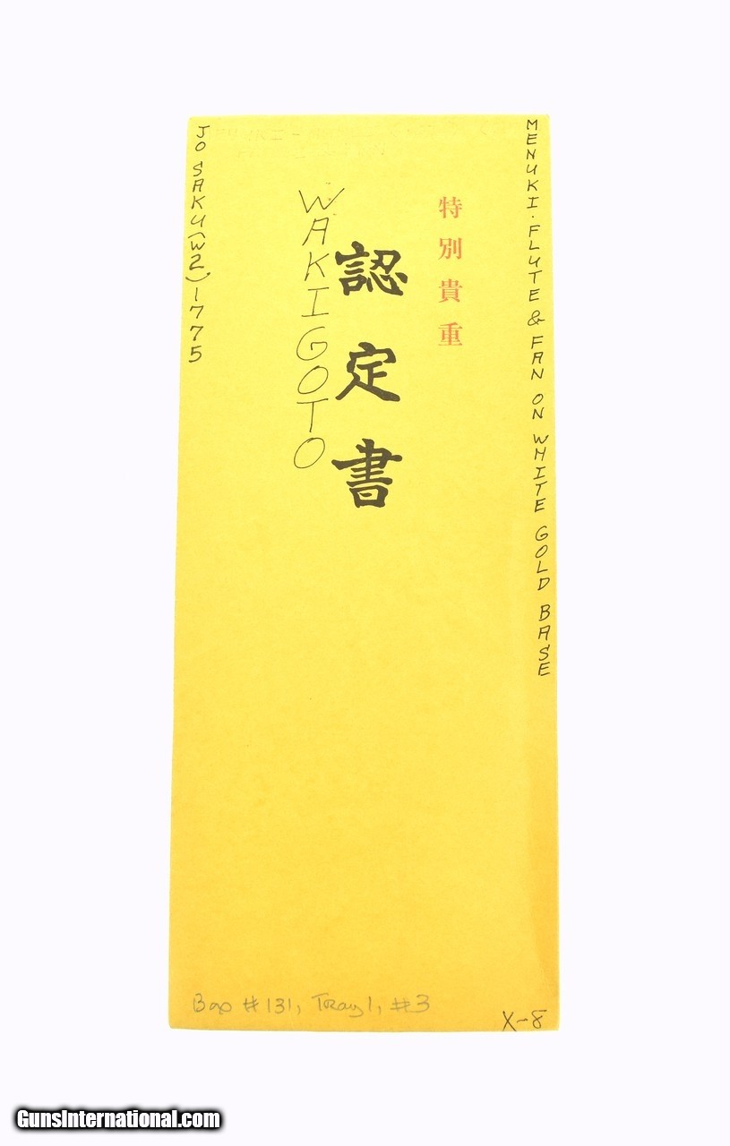 Description: "Kinko Menuko. Shibuchi with gold and silver subject is a flute and war fan. Circa 18th century, Waki Goto with N.B.T.H.K. Certificate. SOLD |