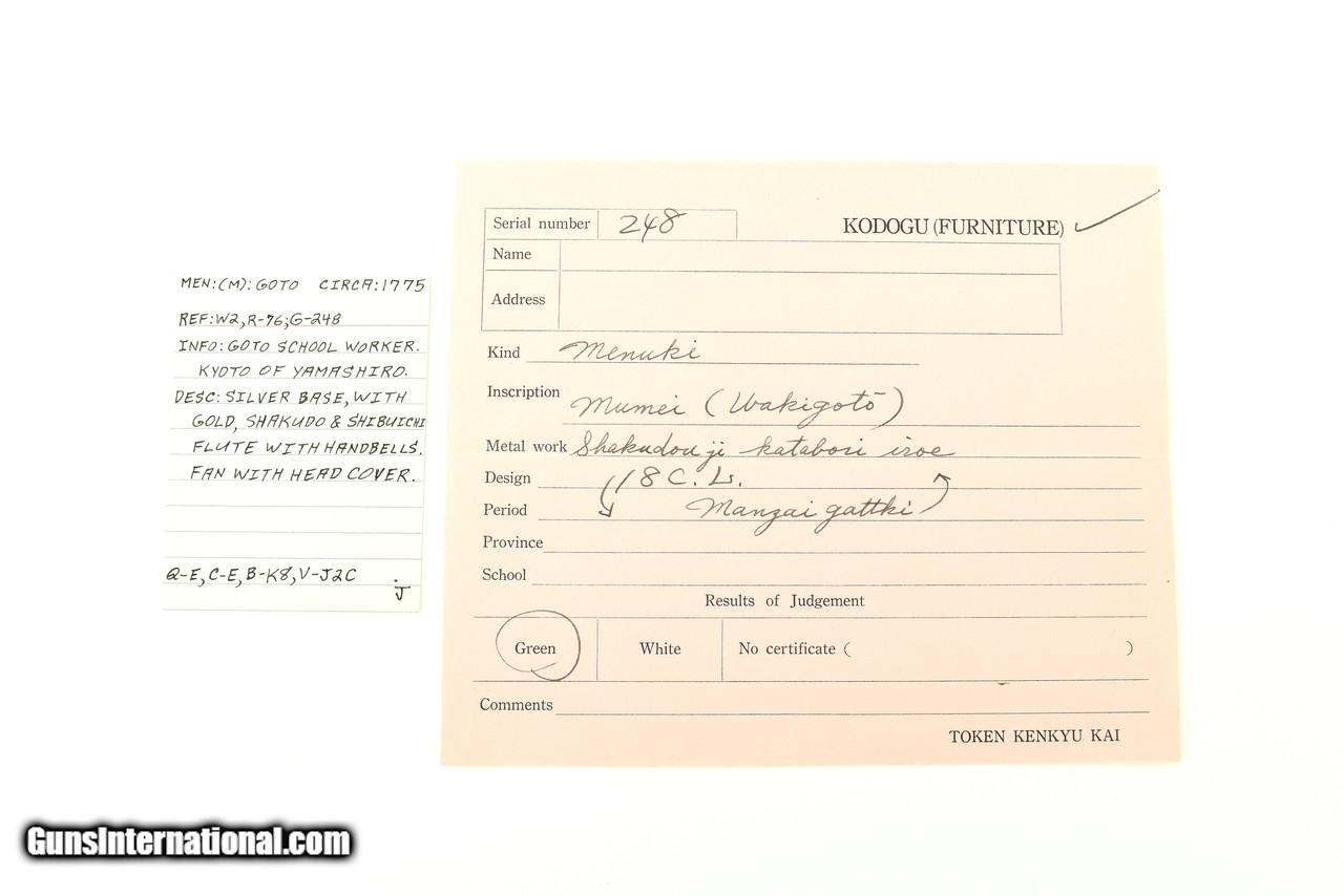 Description: "Kinko Menuko. Shibuchi with gold and silver subject is a flute and war fan. Circa 18th century, Waki Goto with N.B.T.H.K. Certificate. SOLD |
