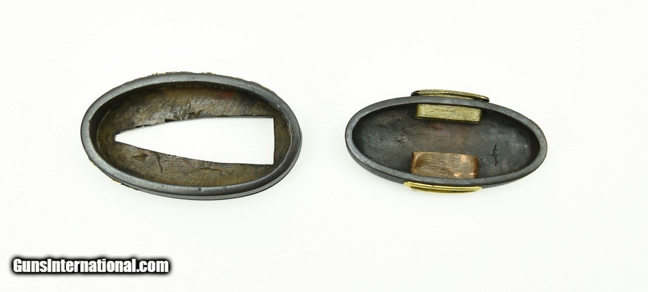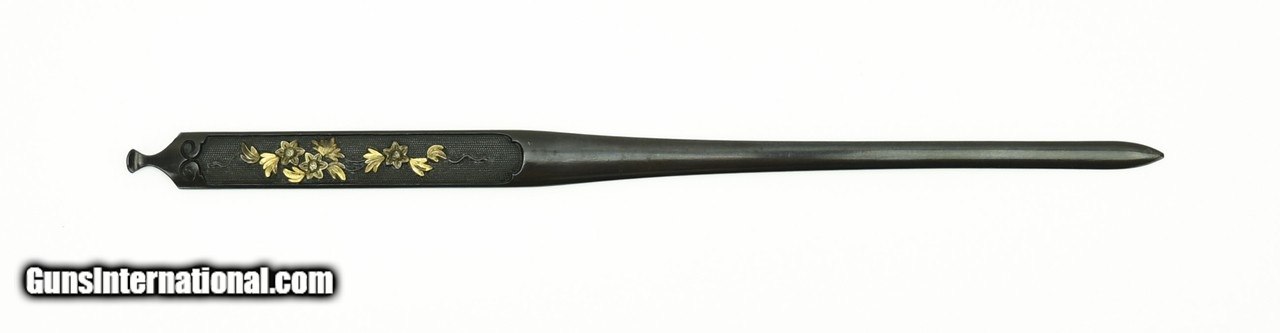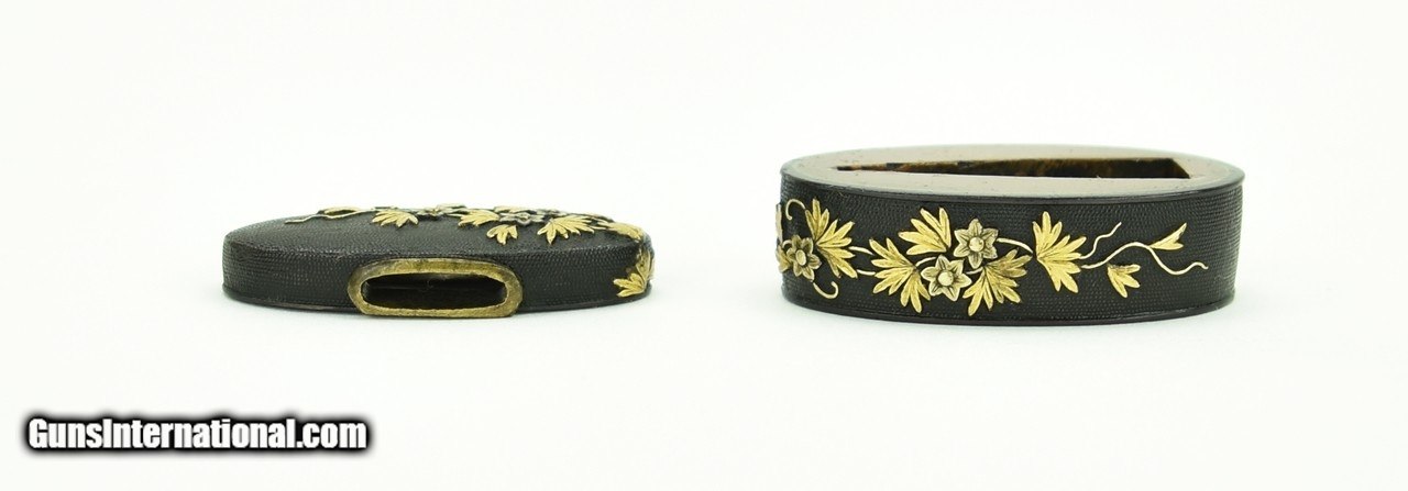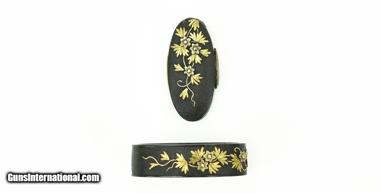 Description: "Kinko set of Kodzuka, Kogai, and Fuchi Kashira. Shakudo Nanako ground. Silver peonies with gold leaves and tendrils. Unsigned. Note: this is a very closely associated set. SOLD |