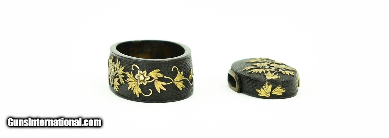 Description: "Kinko set of Kodzuka, Kogai, and Fuchi Kashira. Shakudo Nanako ground. Silver peonies with gold leaves and tendrils. Unsigned. Note: this is a very closely associated set. SOLD |