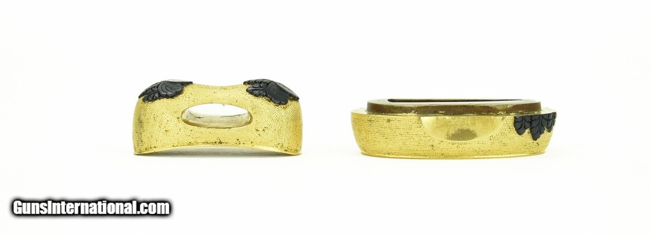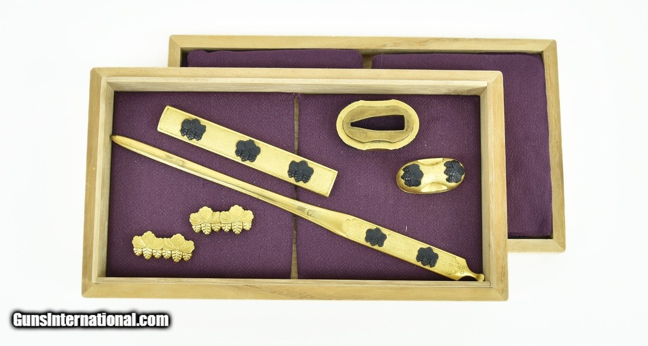 Description: "Kinko set of Kodzuka, Kogai, Fuchi Kashira, and Menuki. All in gold with Shakudo Mon. Menuki Mon in gold, Kodzuka, Kogai and Fuchi Kashira in Nanako ground. Very beautiful set. Would look even better mounted. SOLD |