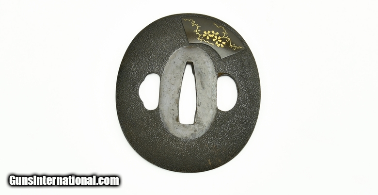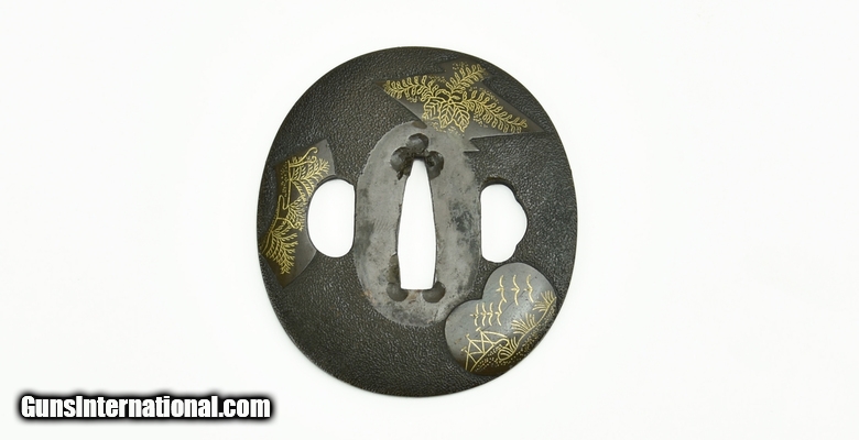 Description: "Kinko Tsuba, Foliage and Birds with gold highlights. 2 ¾", 6.9 cm. Excellent condition. SOLD |