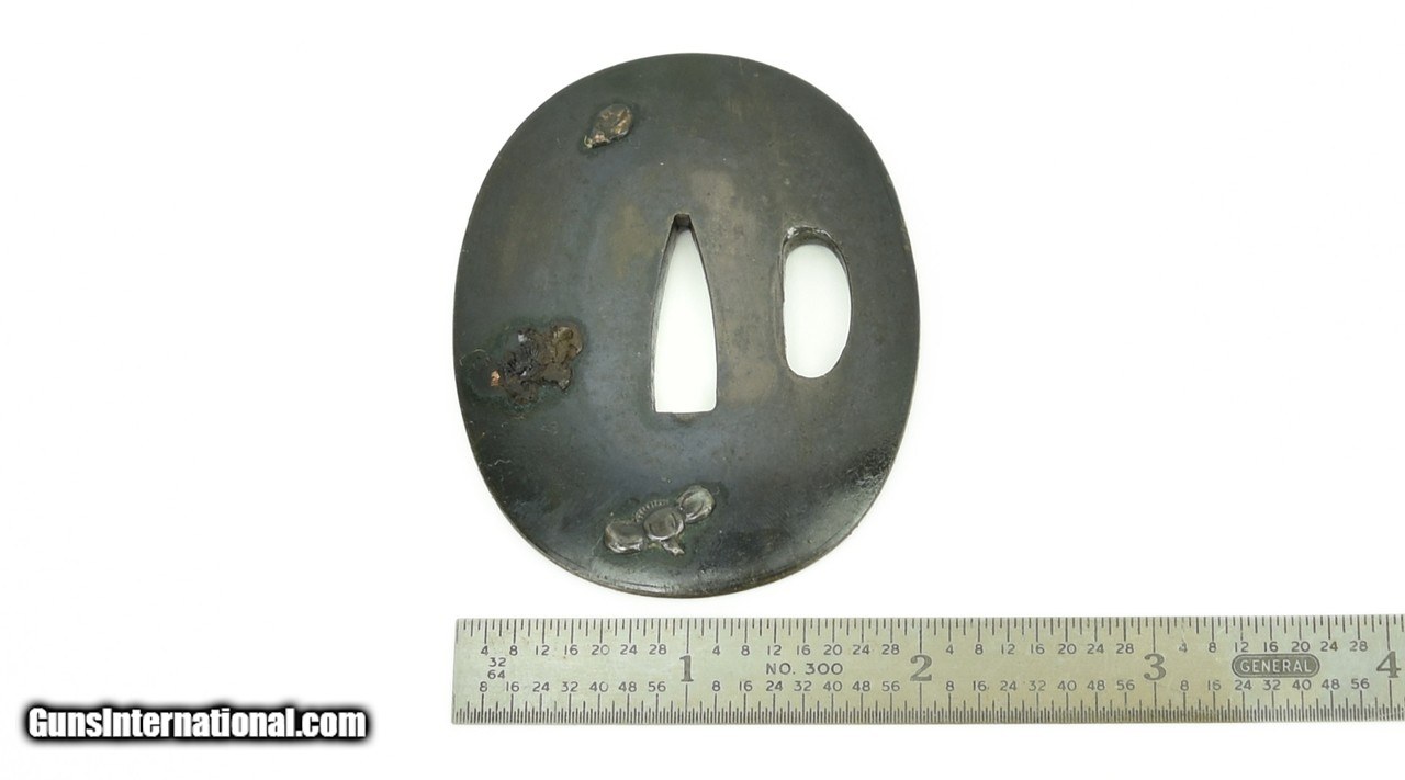 Description: "Kinko Tsuba. Shakudo with gold highlights. Diameter: 2 ½", 6.5cm. Very good condition. SOLD |