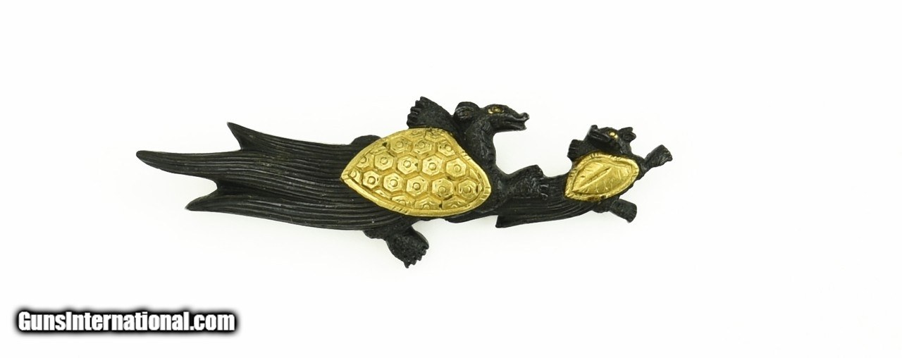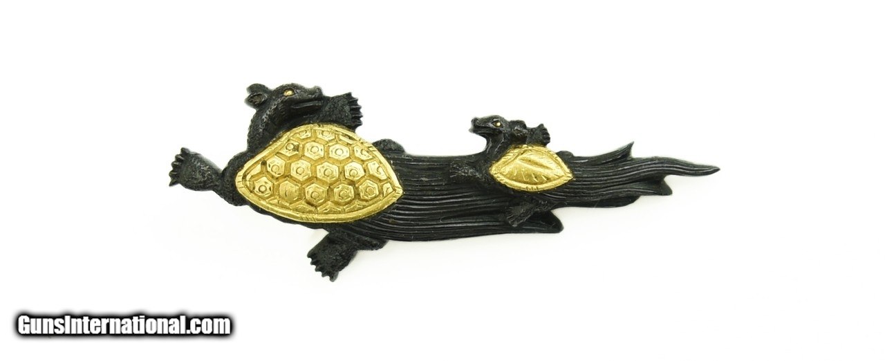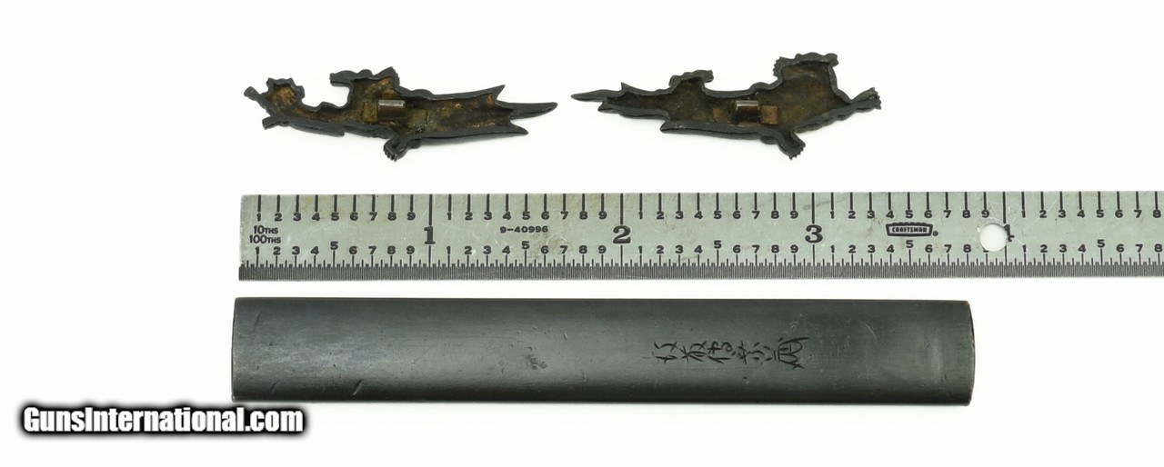 Description: "Kodzuka and Menuki set. Kodzuka is shakudo nanako ground. Shakudo Tensu with gold back. Signed with Goto signature. Menuki are shakudo ground with gold backed Tensu. SOLD |