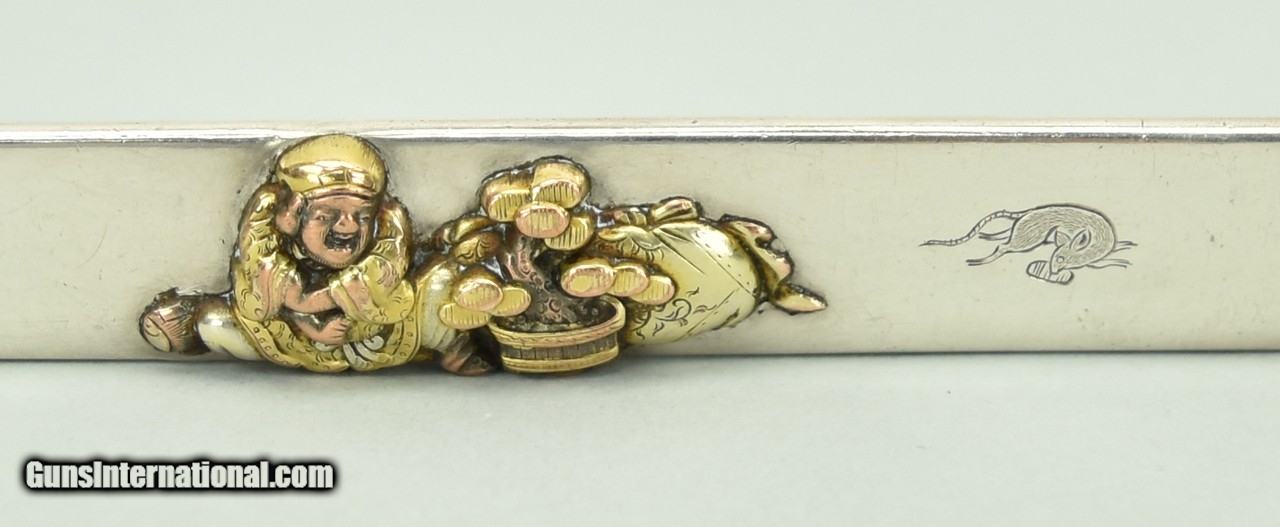 Description: "Kodzuka figure with bag of Wealth. Note rat to right of the figure eating bread. Figure is possibly a rat catcher. Unsigned. Excellent condition. SOLD |