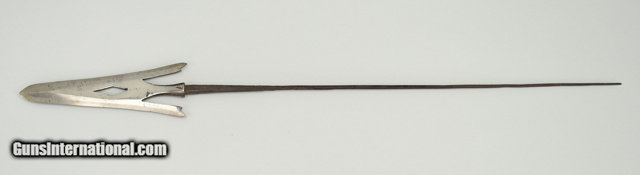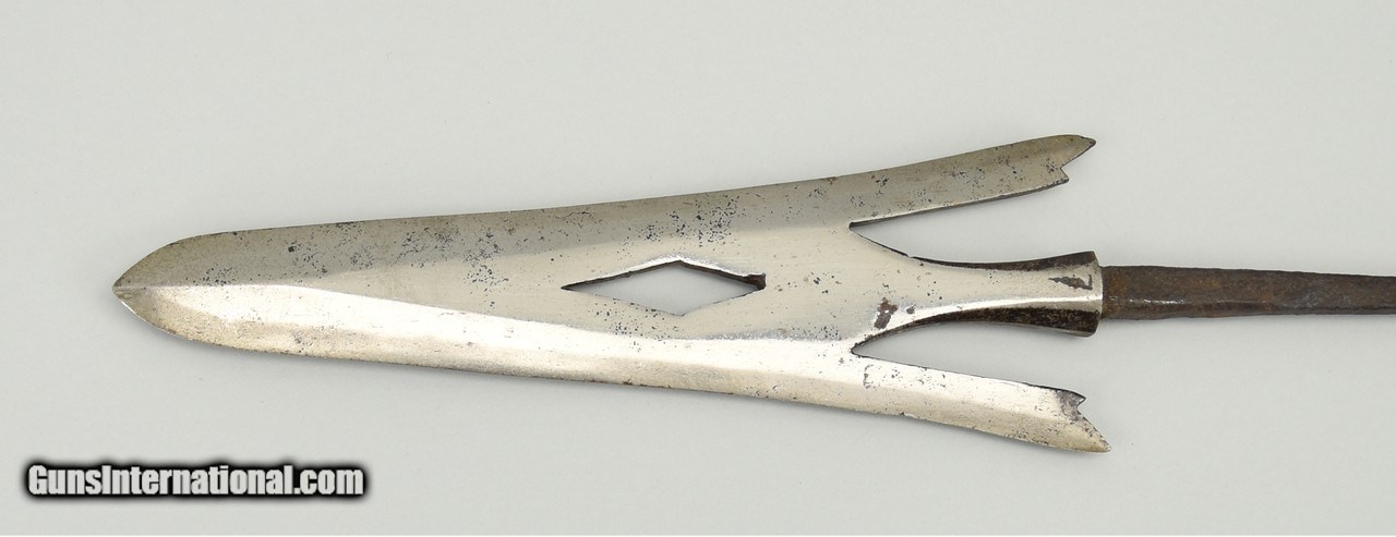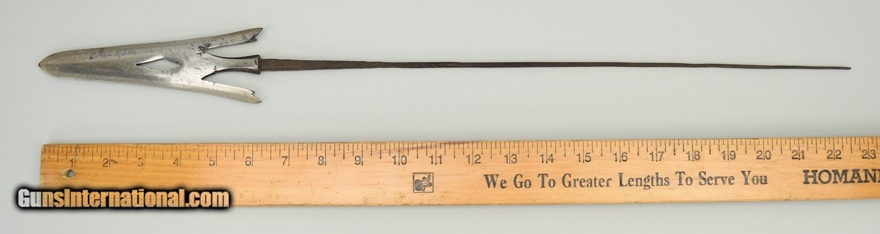 Description: "Large Arrowhead (Yanone). Muromachi period, 16th Century. Watakushi type with extended tip and barbs. Pierced body. Temper line is Suguha (straight temper). 23 ¼" long. SOLD |
